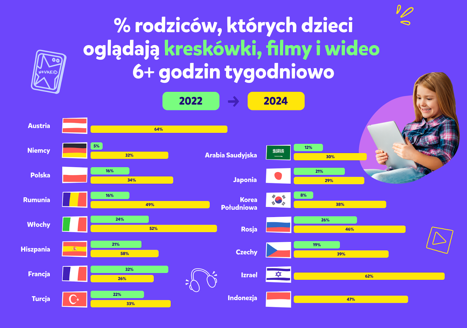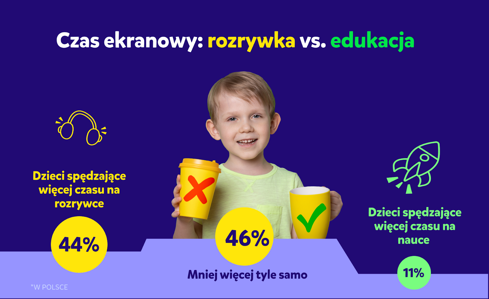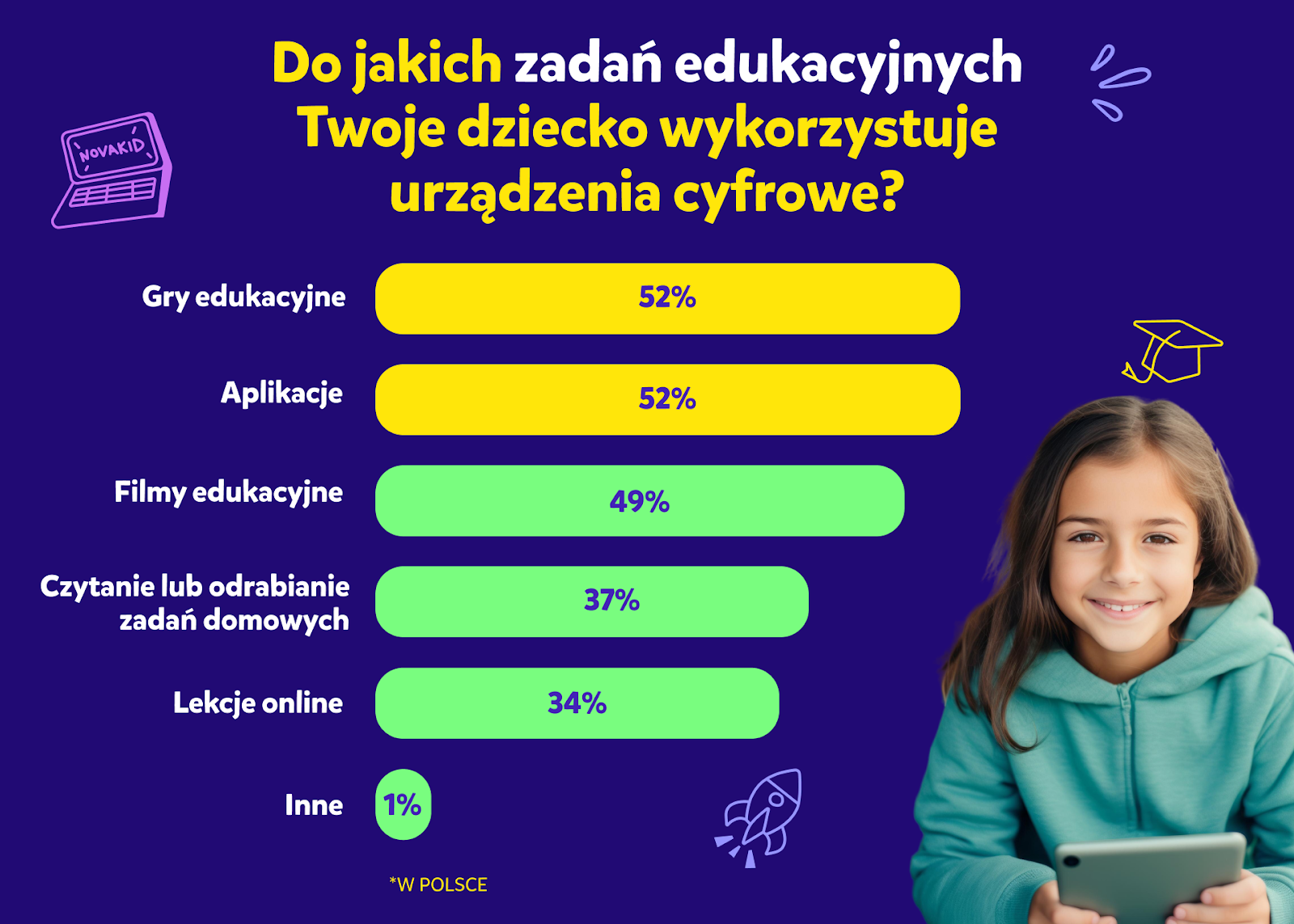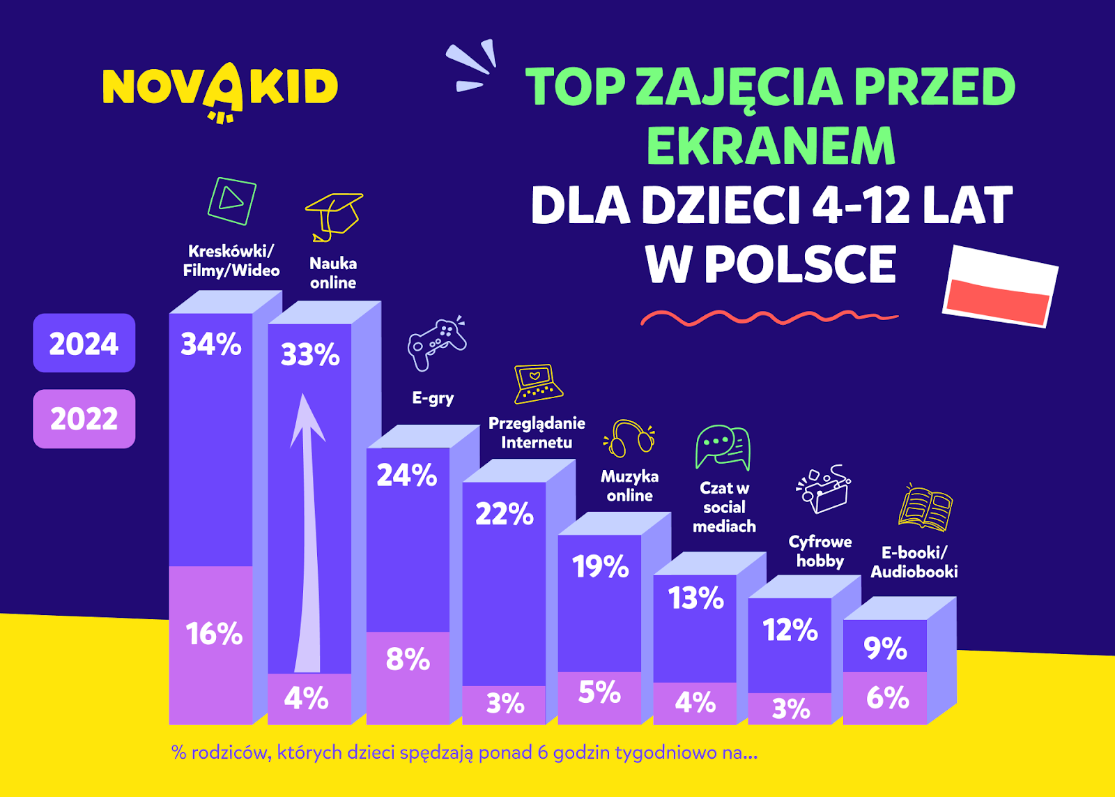 Nie jest tajemnicą, że dzieci spędzają przed ekranami urządzeń coraz więcej czasu, dlatego tak ważne jest zachęcanie ich do spożytkowania go w rozwijający sposób. Wśród najpopularniejszych aktywności online – nauki, oglądania kreskówek i bajek oraz grania w gry online – najbardziej zaskakującym i rokującym odkryciem jest wzrost czasu spędzanego przez dzieci przed ekranem na aktywnościach związanych z edukacją. Odsetek rodziców deklarujących to, że ich dzieci spędzają w ten sposób ponad 6h tygodniowo wzrósł w ciągu zaledwie dwóch lat z poziomu 4% aż do 33%. W 2022 r. większość rodziców (68%) twierdziła, że ich dzieci spędzały na nauce online mniej niż dwie godziny tygodniowo. W 2024 r. najliczniejszą grupę (40%) stanowili rodzice deklarujący, że ich dzieci  poświęcają na naukę przed ekranami między 3 a 6 godzin tygodniowo. Jest to najbardziej optymalna ilość czasu, ponieważ pozwala ona utrzymać odpowiedni poziom entuzjazmu wśród dzieci, które traktują naukę jak rodzaj zabawy.