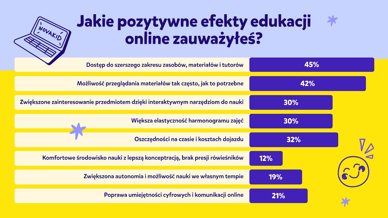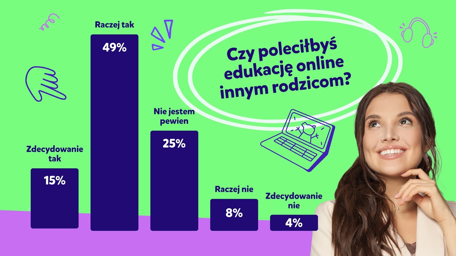 Niemal 65% badanych twierdzi, że chętnie poleciliby edukację online innym rodzicom, którzy szukają dla swojego dziecka ciekawej alternatywy dla tradycyjnej nauki z książek i podręczników. Wynik ten potwierdza, że nie powinniśmy obawiać się technologii w kontekście edukacji wśród dzieci, ponieważ otwiera ona zupełnie nowe drzwi do poznawania świata i rozwijania ich ciekawości.