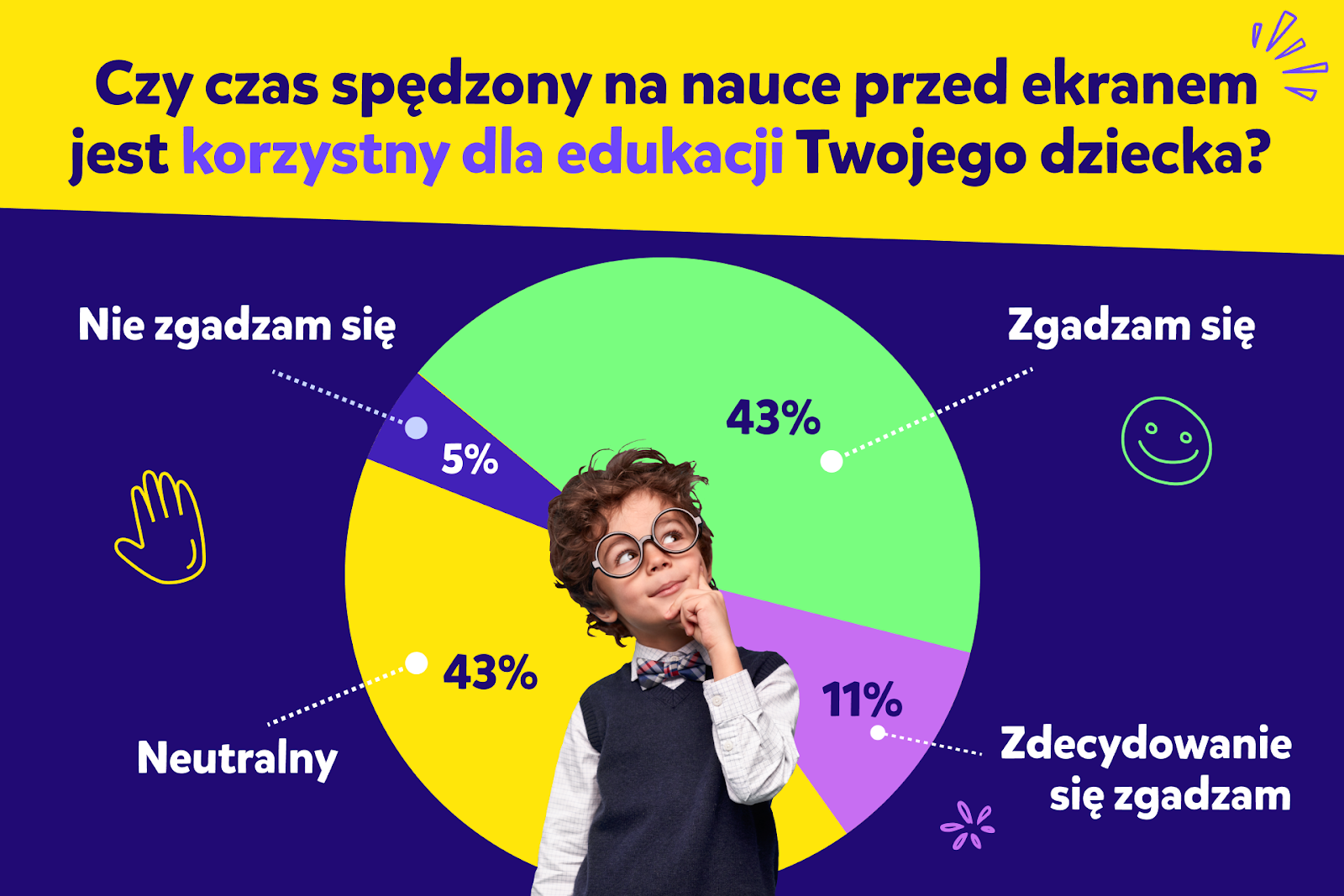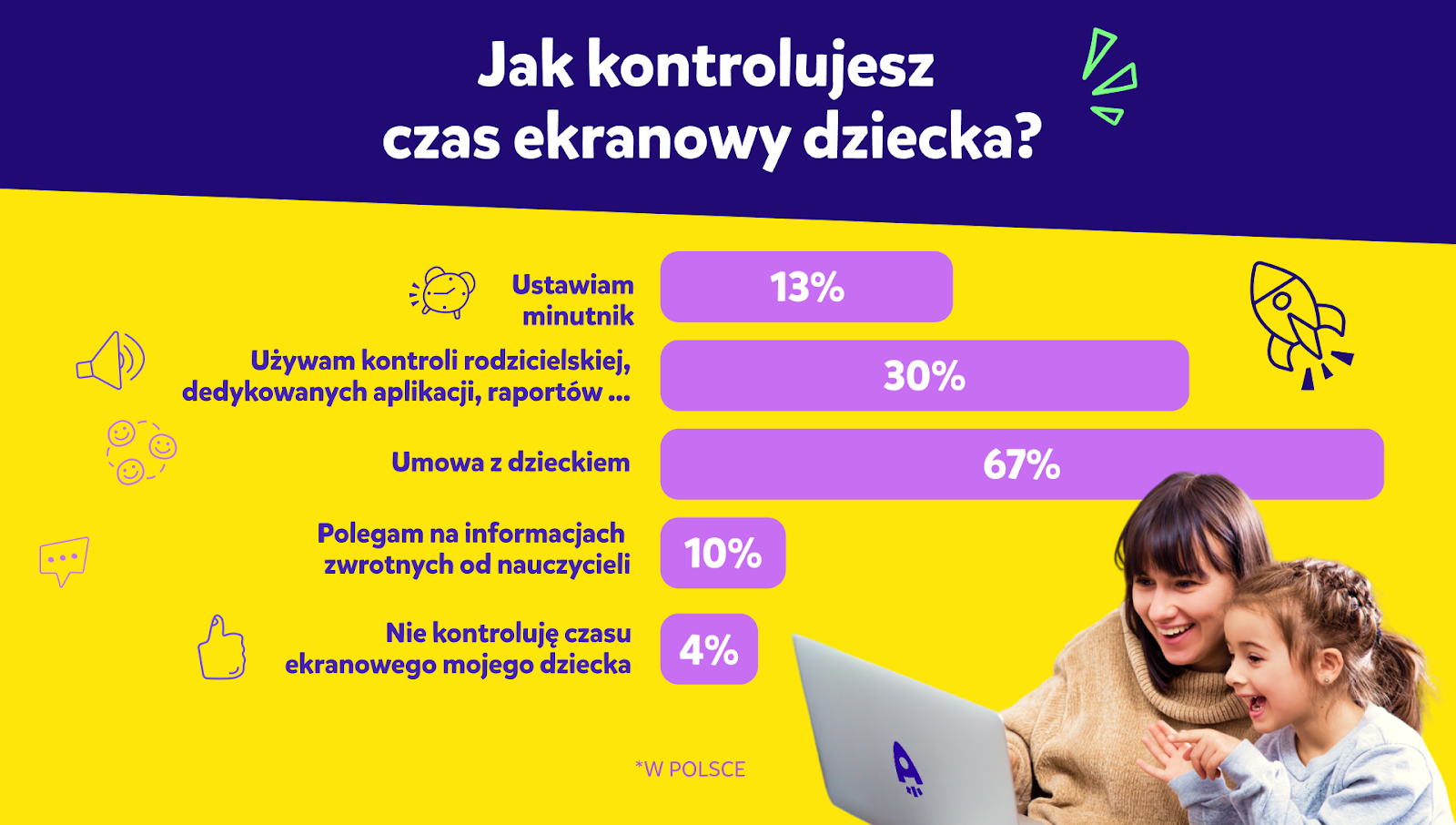 Rosnący trend spędzania czasu przed ekranem wzmacnia znaczenie monitorowania przez rodziców tego, z jakimi treściami ich pociecha ma styczność w trakcie korzystania z sieci. Rodzice chcą wiedzieć, w co i jaki sposób angażują się ich dzieci przed ekranami swoich telefonów i urządzeń. W jaki sposób to kontrolować? 67% z nich odpowiedziało w ankiecie, że zawarcie z dzieckiem umowy jest najlepszą metodą. Niektórzy decydują się na ustawienie minutnika lub stopera (13%), a jeszcze inna część rodziców – na dedykowane aplikacje dla rodziców (30%).