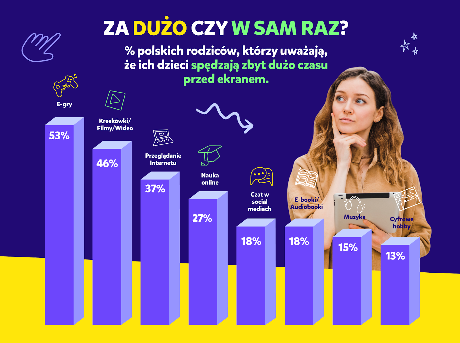 W obecnym czasie coraz więcej rodziców zauważa u swoich dzieci problem zbyt długiego korzystania z urządzeń podłączonych do Internetu, co może w niedługim czasie doprowadzić nawet do uzależnienia. Aż 53% ankietowanych zaznaczyło, że ich pociechy spędzają na grach komputerowych (nieedukacyjnych) o wiele za dużo czasu. Podobny odsetek (46%) dotyczy również oglądania w sieci kreskówek, bajek oraz innych form wideo. Te wyniki mogą być alarmujące w kontekście prawidłowego rozwoju u dzieci, dlatego tak ważne jest kontrolowanie zarówno czasu spędzanego przed ekranem, jak i samych treści pochłanianych przez najmłodszych użytkowników Internetu.