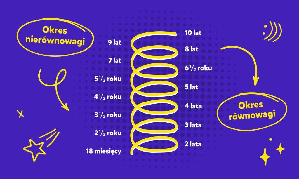 Przechodząc jednak do tego, na co warto zwracać uwagę obserwując dziecko, zachęcamy do zapoznania się z poniższą grafiką. Zostały na niej zaznaczone okresy równowagi i nierównowagi.