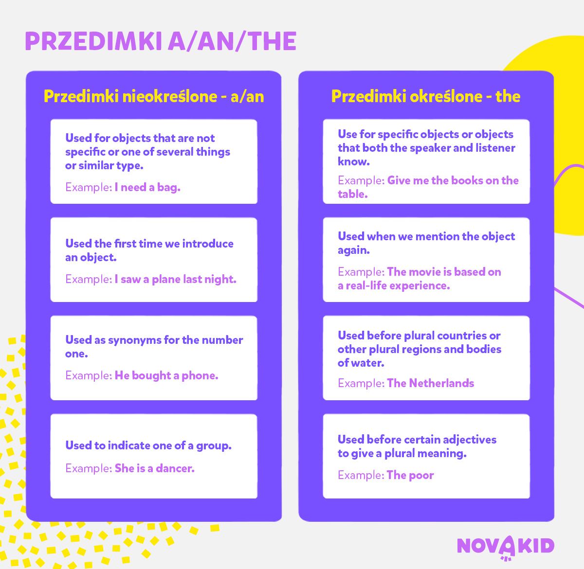 W języku angielskim przedimki nieokreślone „a” i „an” są używane, kiedy mówimy o rzeczach w sposób ogólny, nieokreślony. Przedimek „a” jest używany przed rzeczownikami zaczynającymi się na spółgłoskę, a „an” przed rzeczownikami zaczynającymi się na samogłoskę. Służą one do wprowadzenia nowego elementu do rozmowy po angielsku, który nie był wcześniej znany dla słuchacza.