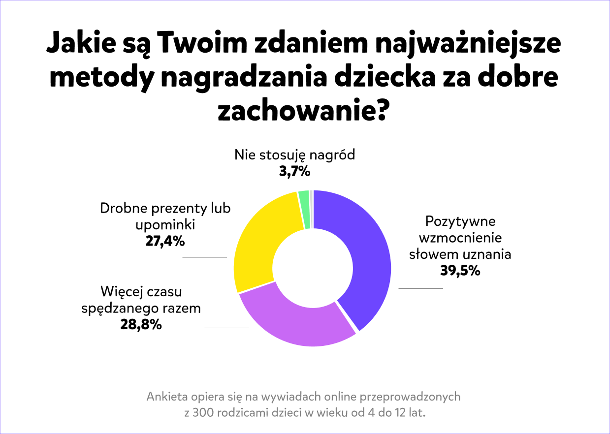 A co na temat nagród sądzą rodzice dzieci, którzy wzięli udział w ankiecie? Najwięcej z nich opowiedziało się za nagrodą w postaci pozytywnego wzmocnienia słowem uznania (39,5%), a kolejne na liście odpowiedzi były drobne prezenty lub upominki (27,4%) i więcej czasu spędzanego razem (28,8%). Tylko 3,7% rodziców odpowiedziało, że nie stosuje nagród wcale.
