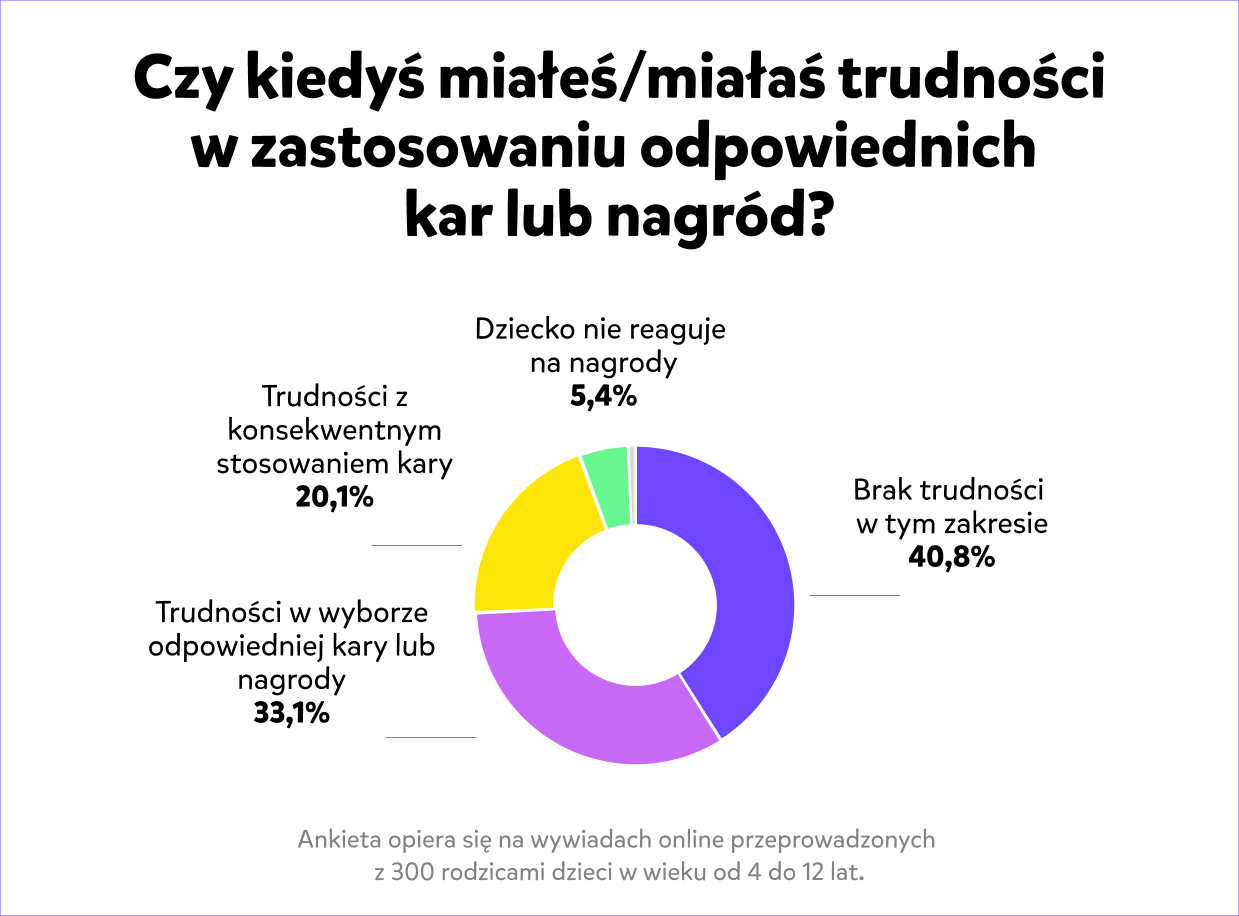 Zapytaliśmy też rodziców, czy w procesie wychowawczym napotkali trudności w stosowaniu odpowiednich kar lub nagród. Okazuje się, że 40,8% rodziców takich trudności nie doświadczyło wcale, a 33,1% napotkało je w pewnym stopniu, na poziomie odpowiedzialności za wybór odpowiedniej kary lub nagrody. Co ciekawe, 20,1% rodziców przyznało, że miewa trudności z konsekwentnym stosowaniem kary u dzieci.