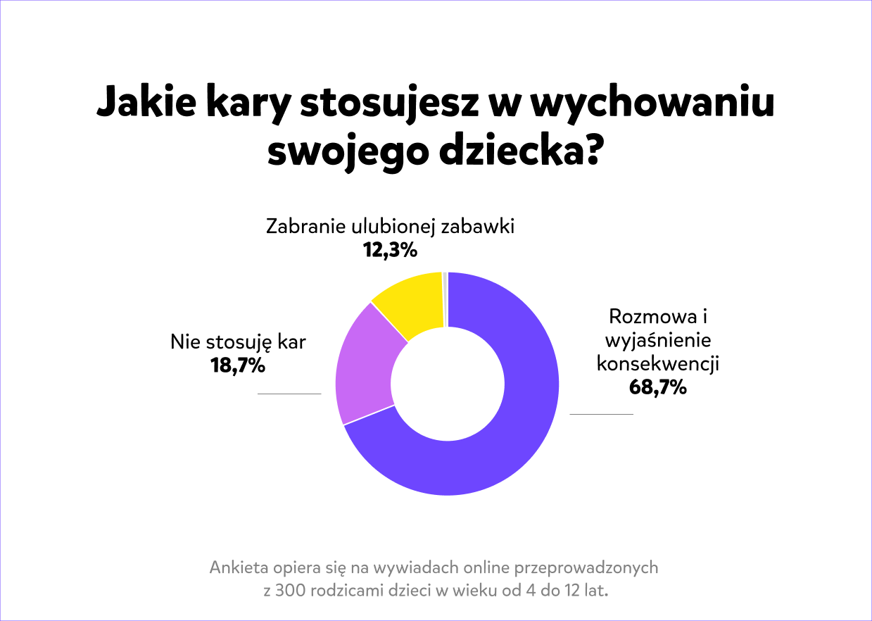 Co ciekawe, ankieta przeprowadzona wśród rodziców wykazała, że aż 68,7% z nich w ramach kary stosuje właśnie strategię rozmowy i wyjaśnienia konsekwencji. Natomiast 18,7% badanych rodziców stwierdziło, że nie stosuje wobec dziecka żadnego systemu kar.