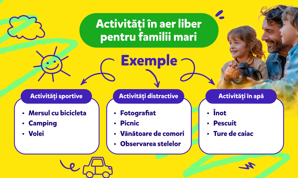 Activitățile în aer liber sunt nu doar o modalitate excelentă de a vă menține sănătoși, ci și pentru dezvoltarea legăturilor de familie. Fie că alegeți să explorați natura pe biciclete, să vă testați talentul de fotograf sau să petreceți o după-amiază relaxantă la picnic, fiecare moment petrecut împreună contează. În plus, aceste activități afară oferă și oportunitatea să purtați conversații în limba engleză pentru copii. Sună bine, nu e așa?