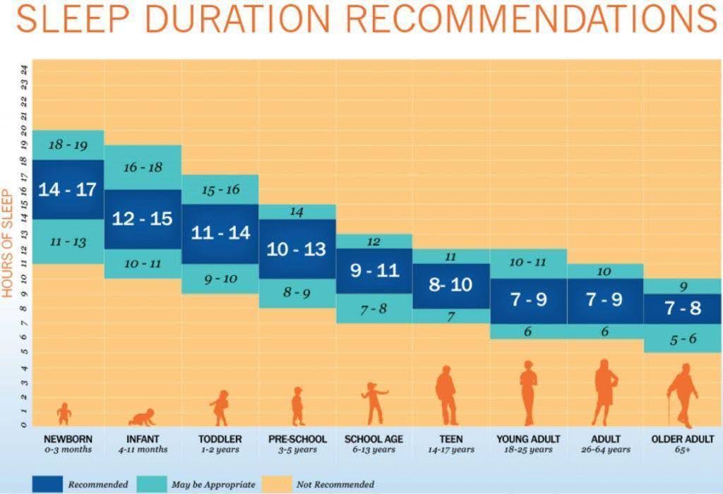 Conform National Sleep Foundation (NSF), durata optimă a somnului pentru copii și adolescenți ar trebui să fie cea indicată în imaginea de mai jos.