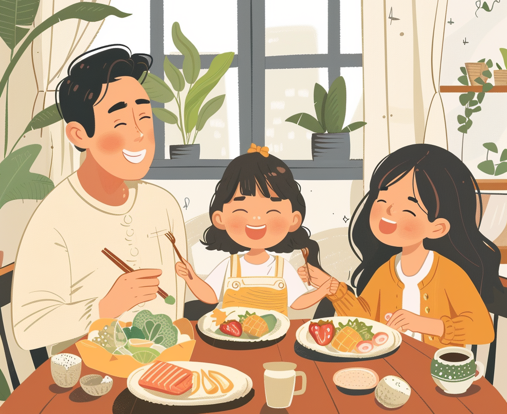 Comportamentul la masă: Arată-i cum să folosească tacâmurile corect, să nu vorbească cu gura plină și să aștepte până toată lumea este servită înainte de a începe să mănânce.
