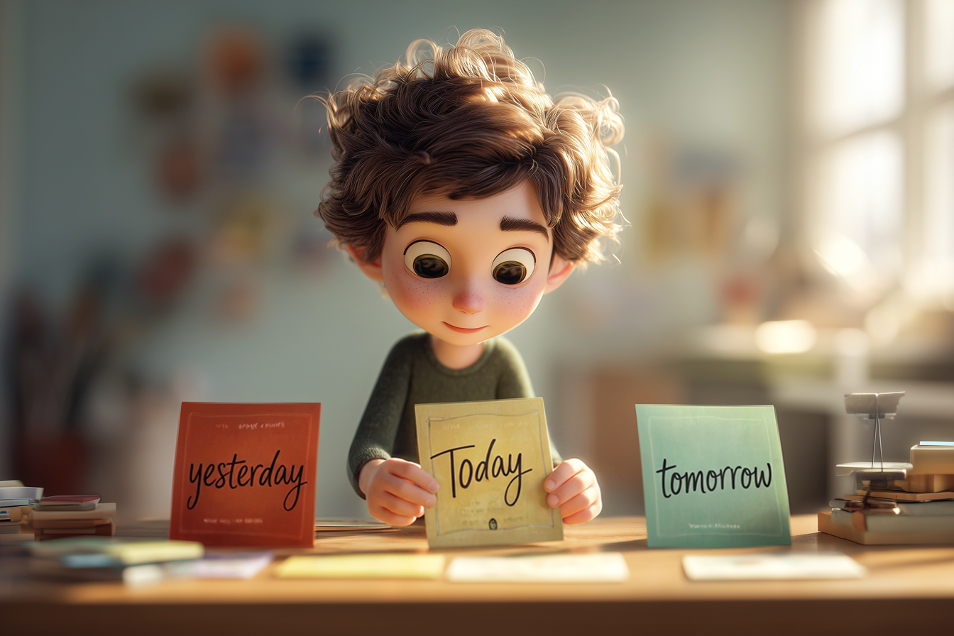 În jur de 8-12 ani, copiii deja folosesc mai multe forme verbale fără să știe cum se numesc. Acum putem introduce denumirile simple ale timpilor: Present Simple, Past Simple, Future.