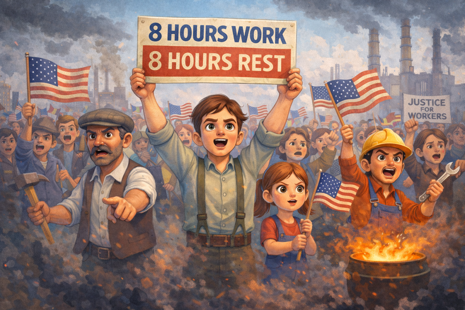 Pe 1 mai 1886, în orașul Chicago din Statele Unite, sute de mii de muncitori au făcut proteste pentru a cere un program mai corect. Ei voiau ca ziua de lucru să aibă doar 8 ore și spuneau: „8 ore muncă, 8 ore odihnă, 8 ore pentru familie”. Protestele au fost dificile și au existat conflicte cu poliția, iar câțiva lideri ai muncitorilor au fost pedepsiți câteva zile mai târziu.