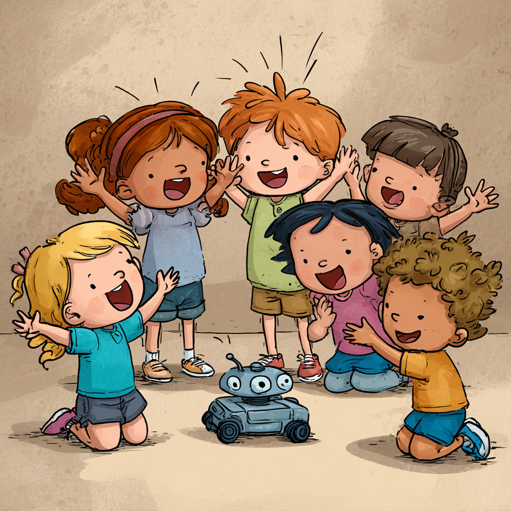 (Copiii sunt fericiți datorită unei jucării noi.)