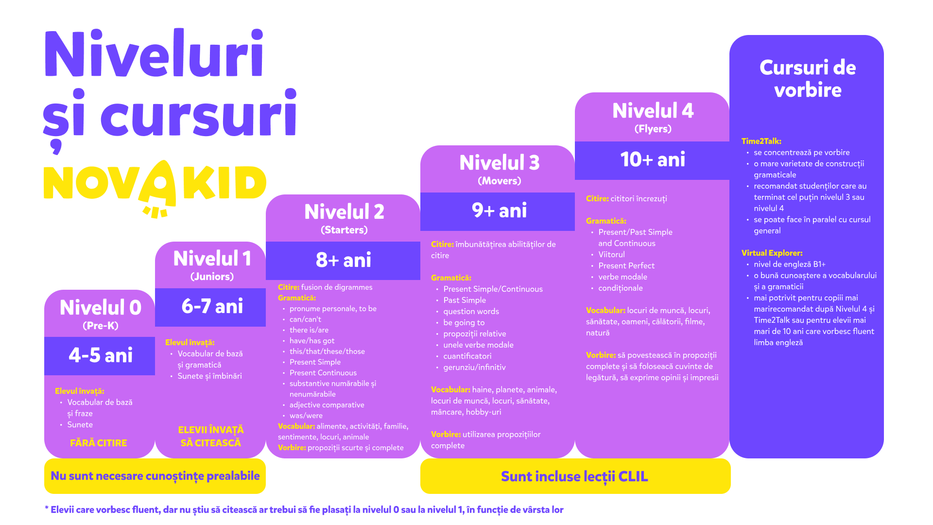 - Nivelurile de engleză și cursurile Novakid pe grupe de vârstă
