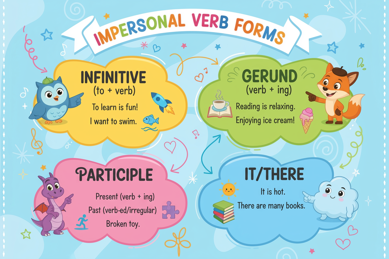 Formele impersonale sunt verbe care nu arată persoana sau timpul. Ele te ajută să vorbești despre acțiuni, scopuri, stări sau existență fără a specifica cine le face. În continuare, vom analiza care sunt aceste forme și de ce trebuie să le cunoască copiii care învață engleza, pentru a vorbi mai fluent și natural.