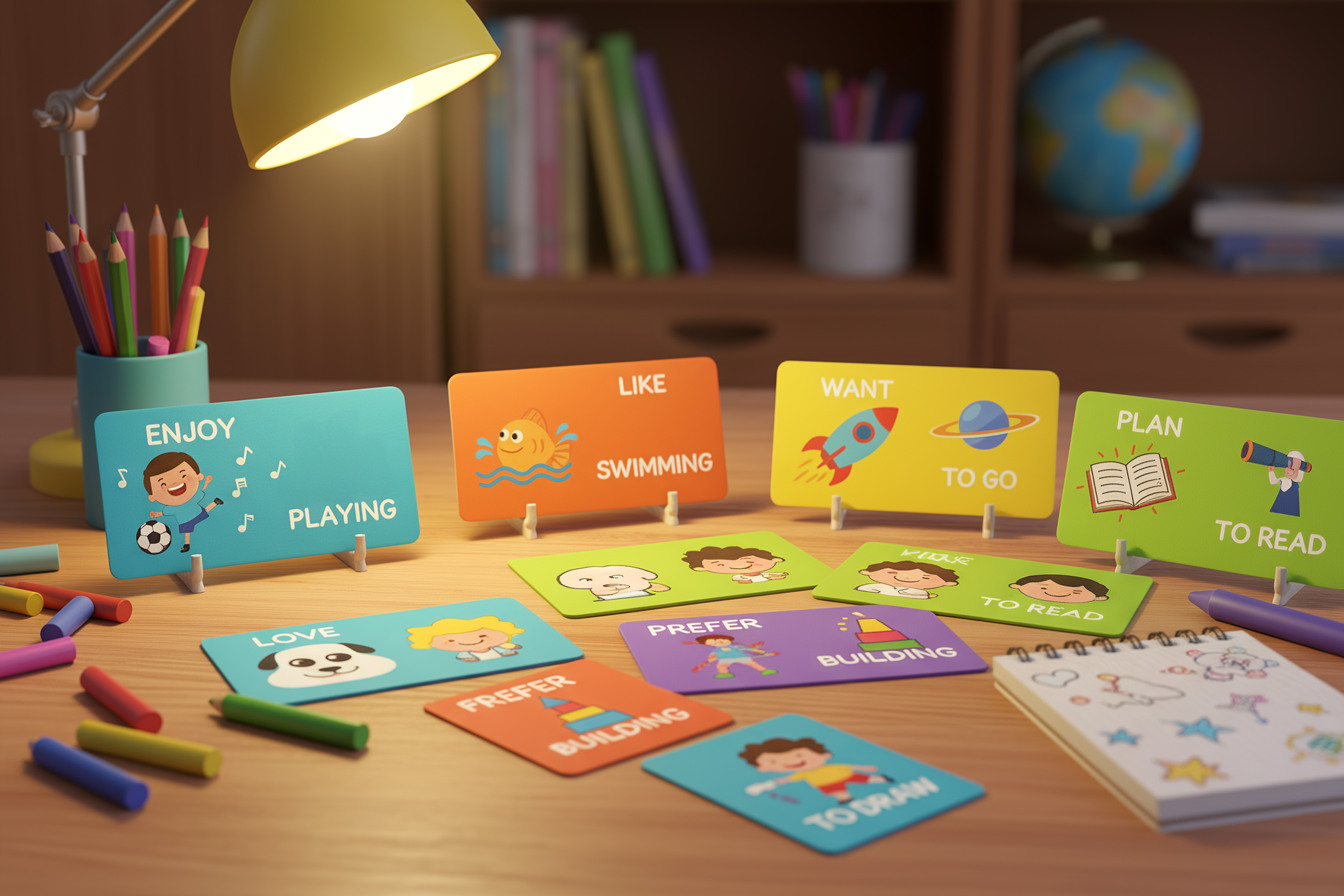 Jocul „Călătoria verbelor”: Copilul completează propoziții cu infinitiv sau gerunziu folosind cartonașe cu imagini. Această activitate îl ajută să distingă natural sensul, și chiar excepțiile. De exemplu: „like reading” (imagine cu un copil relaxat, absorbit în citit – plăcerea de a citi) și „like to read” (imagine cu un copil pregătindu-se să citească, poate un ceas în spate – acțiune planificată).