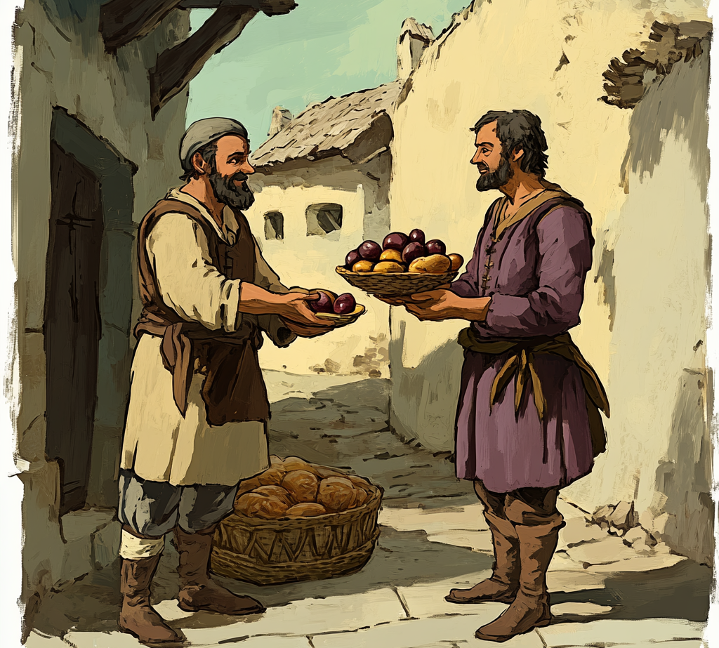 De exemplu, un pescar putea schimba peștele său cu pâine de la un brutar. Totuși, acest sistem era complicat și ineficient, deoarece trebuia să găsești pe cineva care avea ceea ce tu doreai și invers. Așa a apărut necesitatea unui sistem de plată mai simplu și universal, ducând la inventarea banilor.