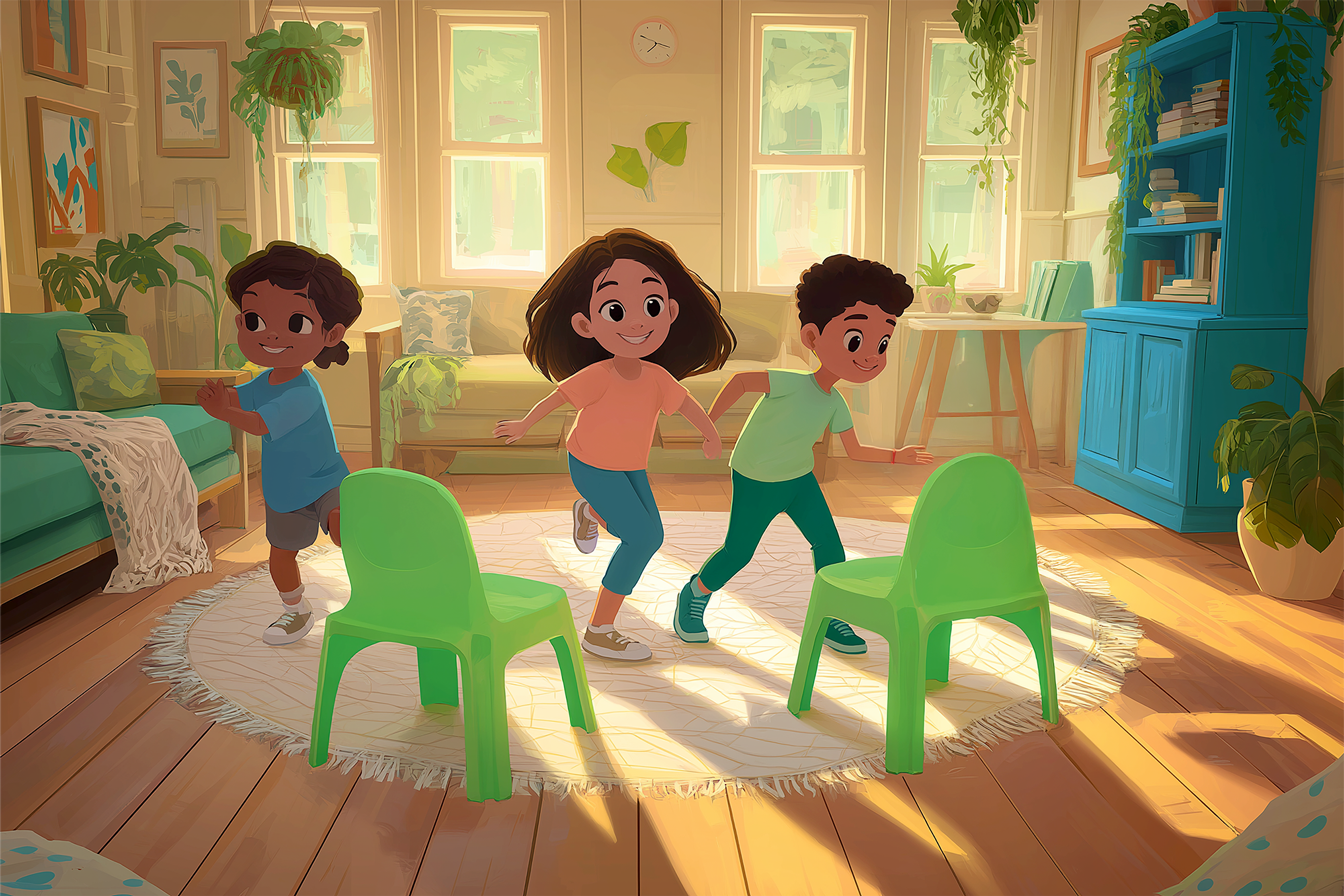 Copiii se plimbă în jurul unui șir de scaune, iar când muzica se oprește, trebuie să ocupe un scaun cât mai repede. „Scaunele muzicale” îmbunătățesc coordonarea și reflexele și de multe ori se joacă în interior, dar poate fi cu succes și un joc de copii de jucat afară.