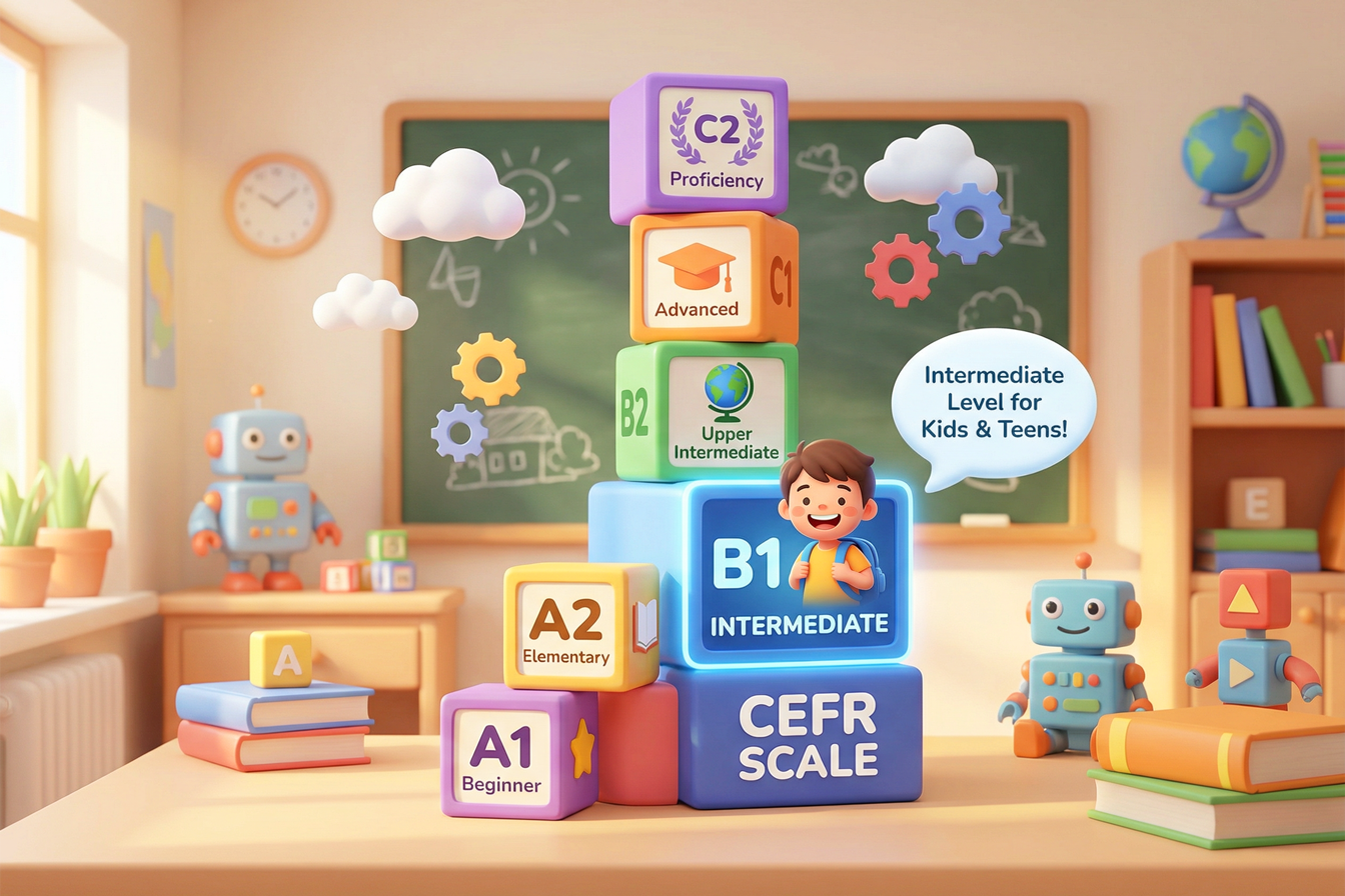 Ce știe concret un copil la nivel B1, cum se vede progresul față de A2 și ce urmează spre B2. Ghid clar pentru părinți și copii.
