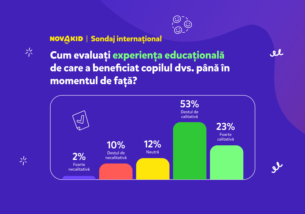 Încrederea în cadrele didactice și în instituțiile de învățământ impactează semnificativ colaborarea familie – școală. Potrivit sondajului, 76% dintre părinții români se declară mulțumiți de experiența educațională a copiilor lor, considerând-o calitativă, în timp ce 12% se poziționează la polul opus.