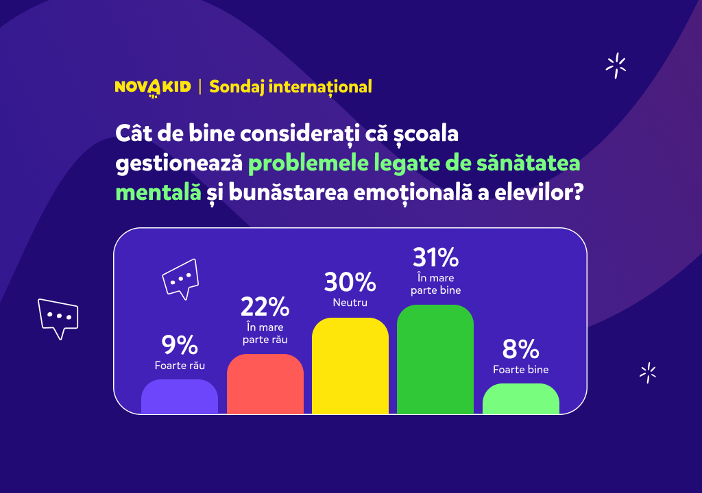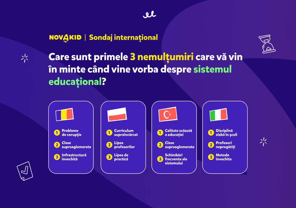 Pentru că acest aspect este unul de mare interes, platforma Novakid a derulat un studiu ce vizează gradul de satisfacție al părinților față de învățământ, îmbunătățirile ce pot fi aduse și temerile existente. Colectarea datelor s-a realizat în luna februarie 2025, pe un eșantion total de 1200 de persoane din România, Italia, Polonia și Turcia. Continuă să citești articolul pentru a afla cele mai importante concluzii referitoare la țara noastră!