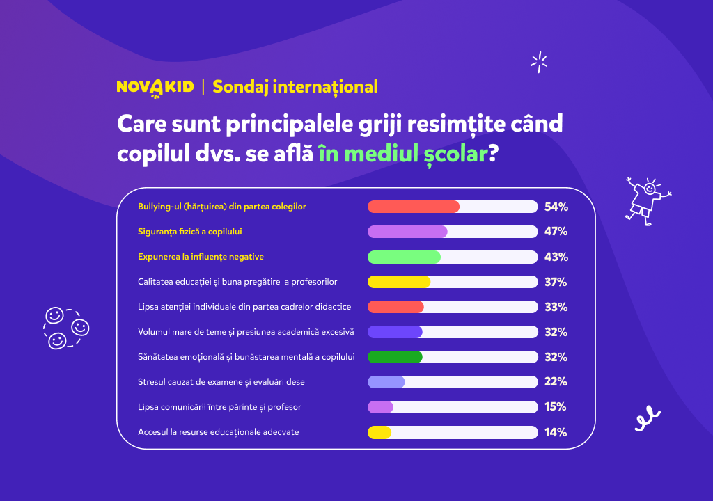 Aceste puncte slabe sunt oglindite de îngrijorările resimțite când juniorii se află în mediul școlar. Printre ele se numără bullyingul (în cazul a 54%), siguranța fizică (pentru 47%), influențele negative (pentru 43%), calitatea educației și pregătirea cadrelor didactice (pentru 37%), lipsa atenției individuale din partea profesorilor (pentru 33%), presiunea academică și volumul mare de teme (pentru 32%), stresul cauzat de examene și evaluări dese (pentru 22%), lipsa comunicării între părinte și profesor (pentru 15%) și accesul la resurse de studiu adecvate (pentru 14%). Bunăstarea emoțională constituie o preocupare pentru 32%, mai puțin de jumătate dintre cei sondați (39%) considerând că este tratată bine.