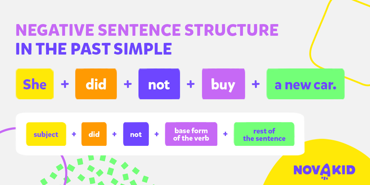 Formăm propoziții negative în Past Simple adăugând verbul auxiliar „did not” sau forma prescurtată „didn’t” după subiect și apoi infinitivul verbului principal. Construim propoziții negative la Past Simple folosind următoarea schemă