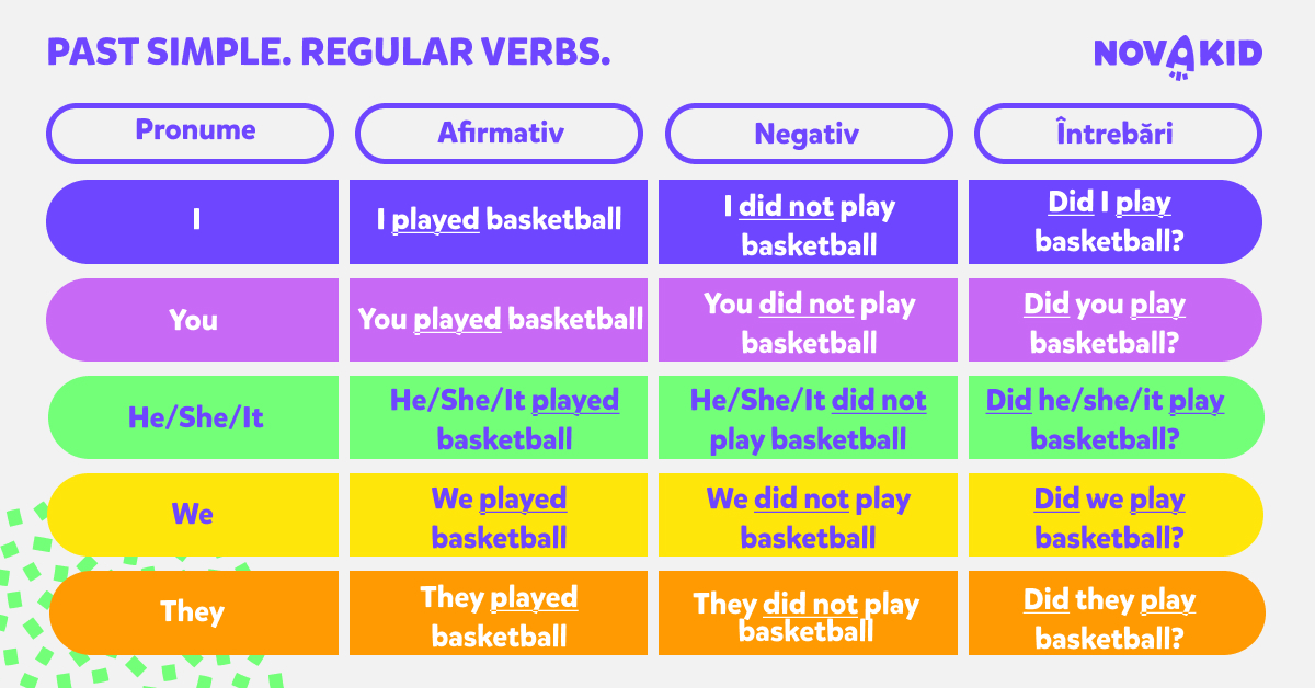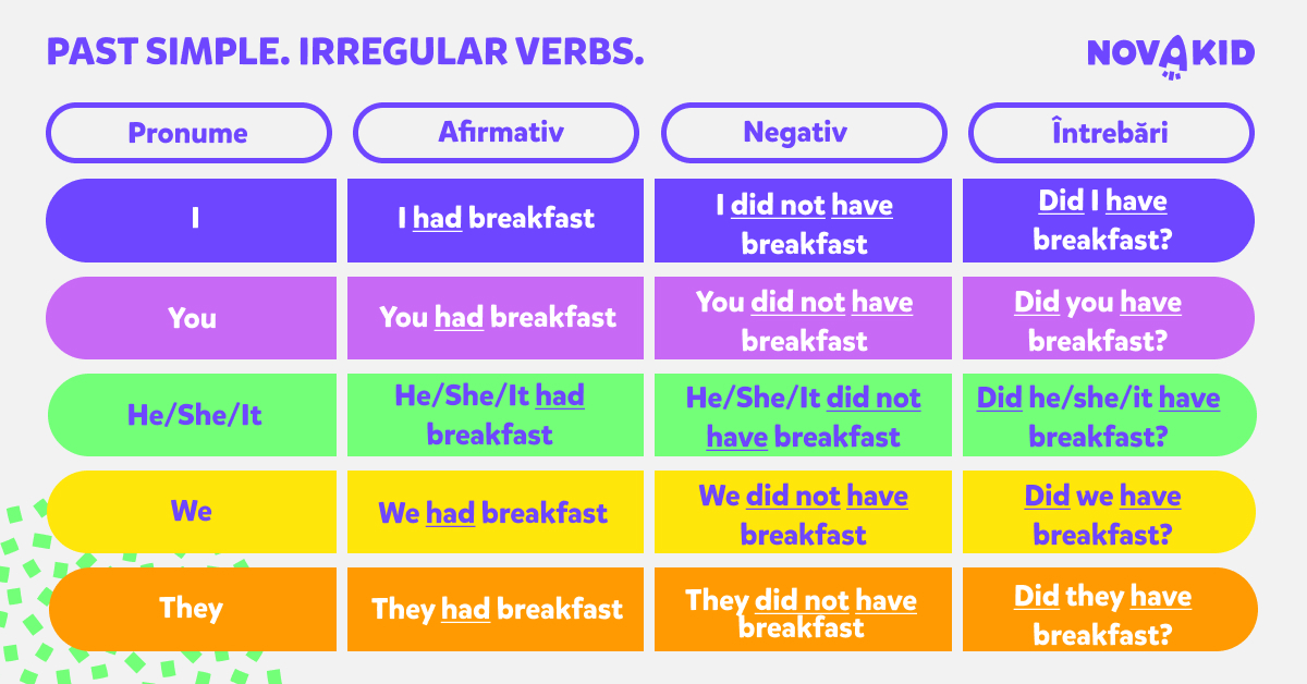 Dacă avem de-a face cu verbe neregulate, trebuie să-l învățăm pe de rost și să ne amintim forma lui. Vei găsi verbe neregulate în tabelul de mai jos, un instrument uitl de avut la îndemână atunci când învățăm engleza pentru copii.
