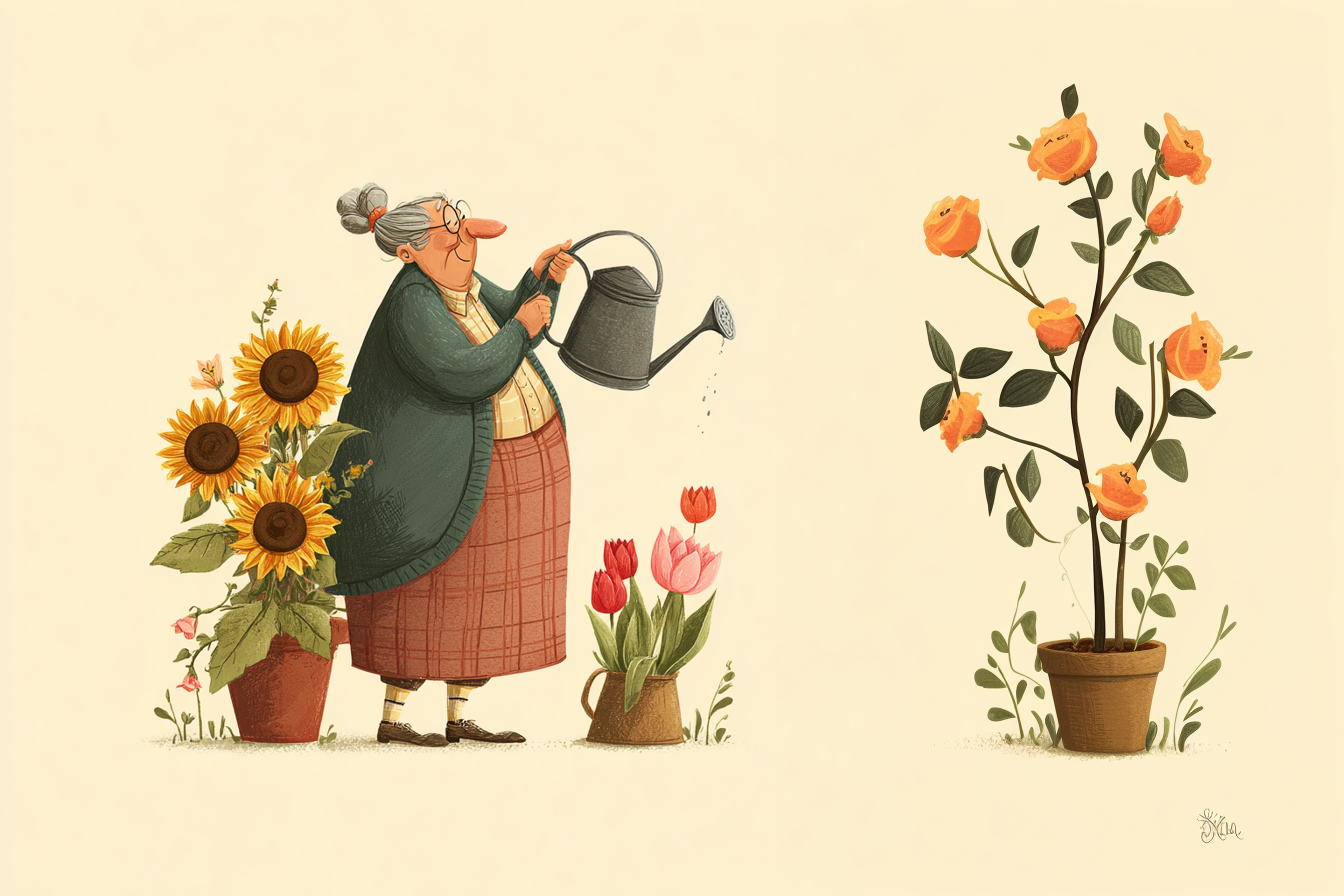 - Every morning, my grandma waters her flowers. She has roses, sunflowers, and tulips. I like helping her because the garden smells amazing.