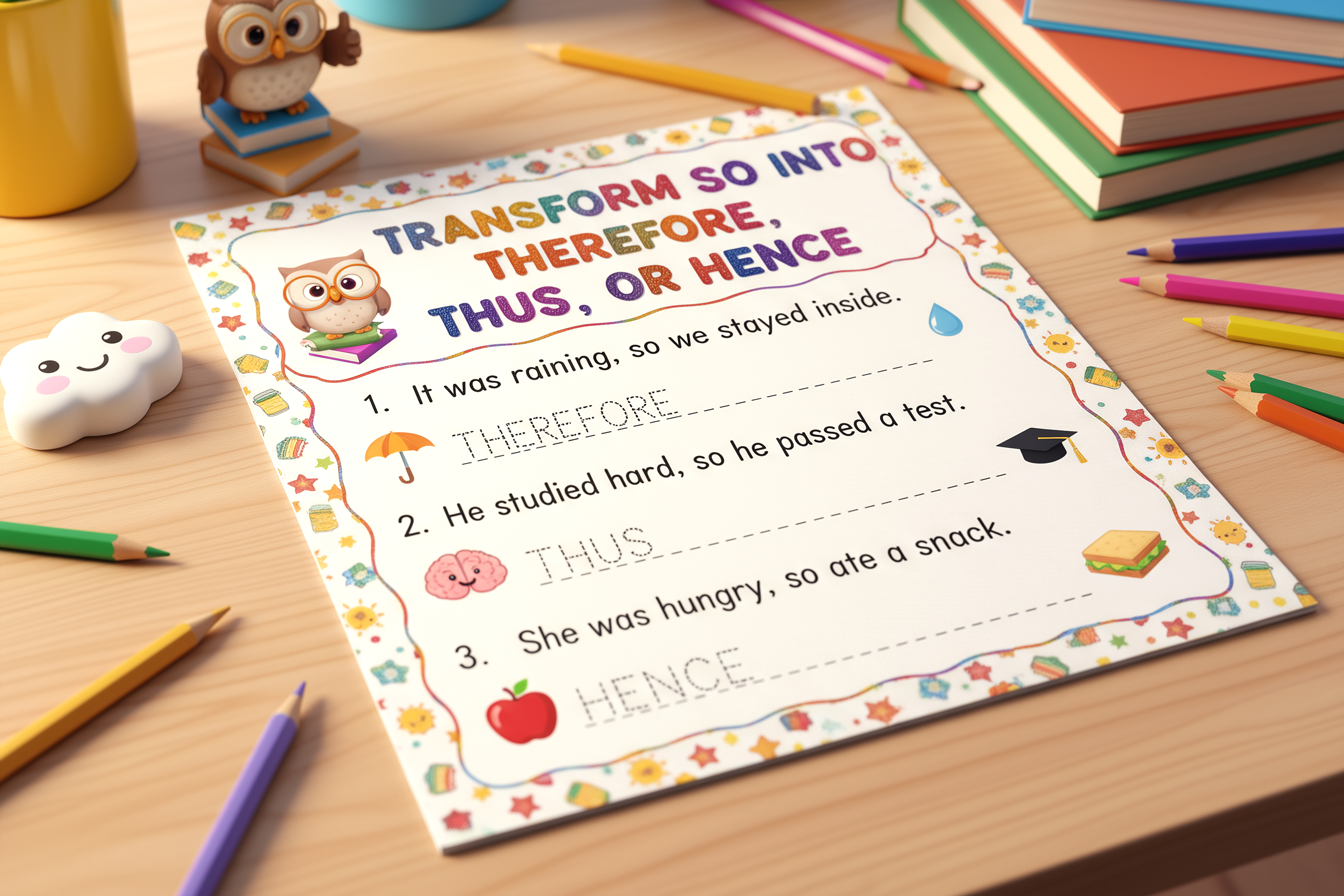 Copilul le trage la întâmplare și le leagă cu therefore, thus sau hence: „It was raining; therefore, we stayed inside.”