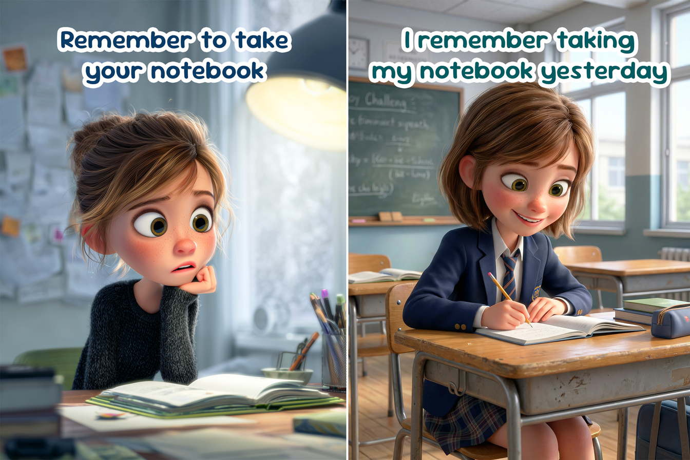 - remember to = „nu uita să…” (ceva ce urmează) → ex: Remember to take your notebook. – Nu uita să-ți iei caietul.