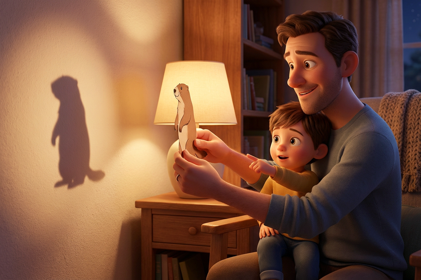 Desenați sau printați o marmotă simplă, colorați-o și lipiți-o pe un bețișor. Folosiți o lanternă și un perete alb pentru „Teatrul umbrelor”: