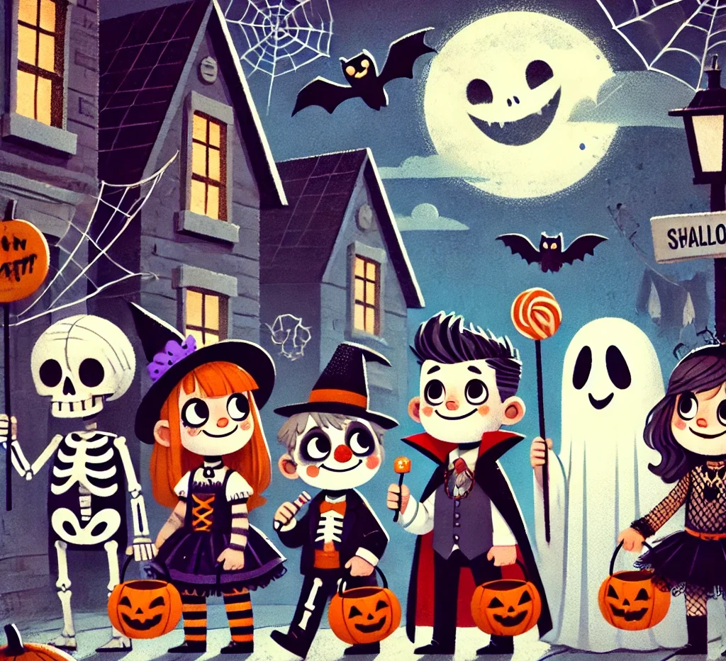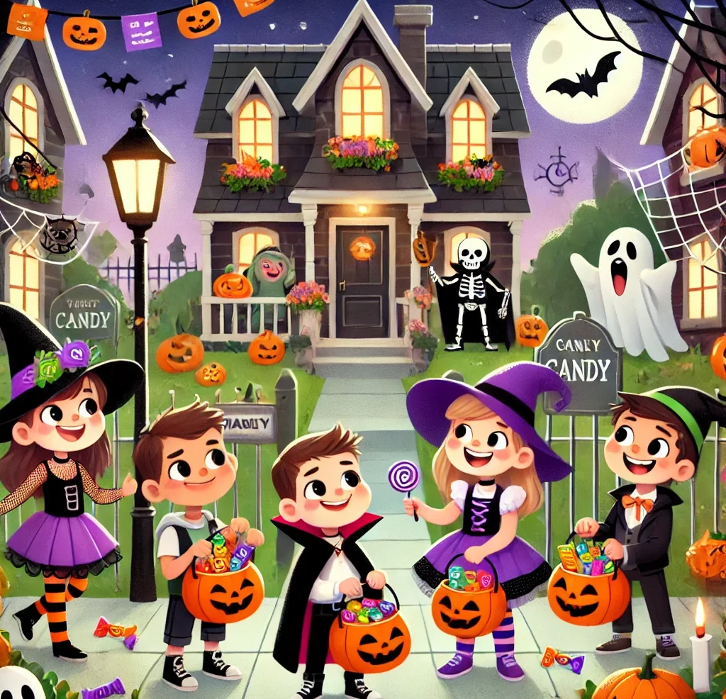 One Halloween night, Emma and her friends dressed up in their costumes and went out to collect candy. Emma was dressed as a witch, and her best friend Max was a vampire. They carried their candy bags, knocking on doors and shouting, “Trick-or-treat!”