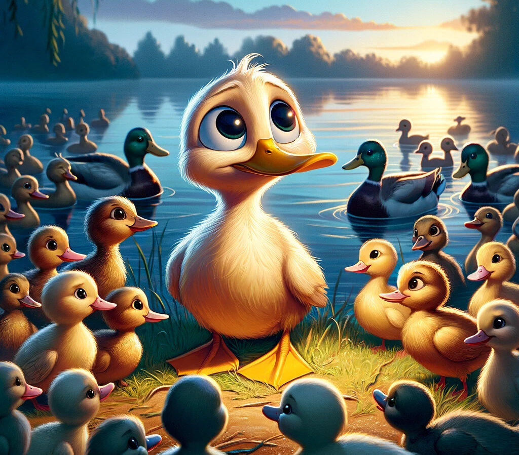 Once upon a time, there was a little duckling born on a farm. It looked different from its brothers and sisters, and they made fun of it. Feeling sad, the duckling left the farm and went on a journey.