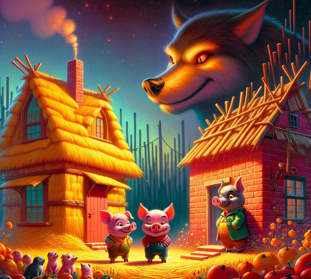Once upon a time, there were three little pigs who lived with their mother in a meadow. One day the mother pig said to the three little pigs, “You need to go out into the world and make your own way.” So they waved “goodbye” and out into the world they went.