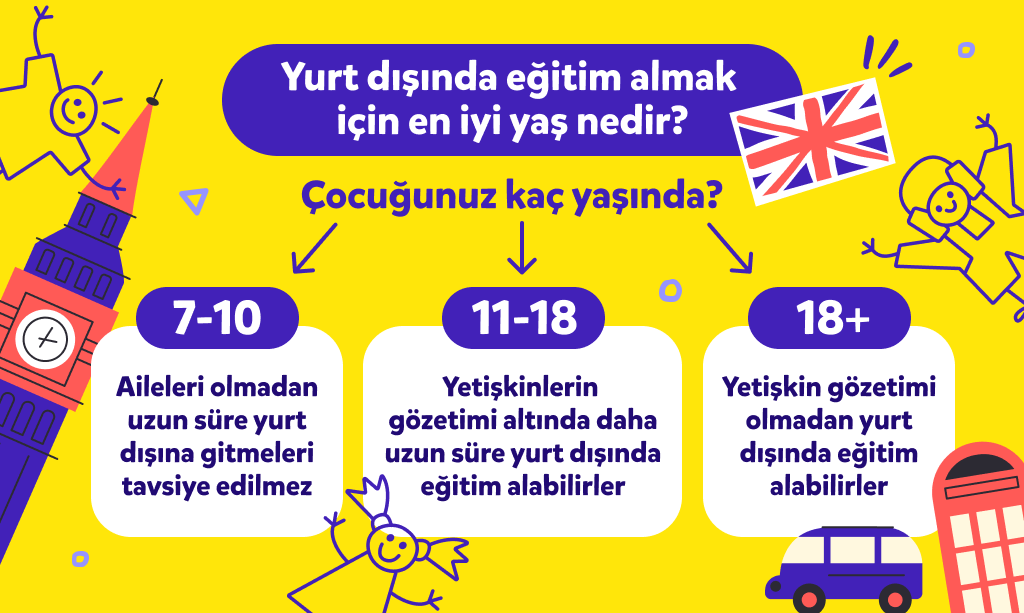 13-18 yaş grubu: Ergenlik çağındaki çocuklar için ise uzun süreli yurt dışı eğitimi fırsatlarını göz önünde bulundururken daha rahat olabilirsiniz. Ancak 18 yaş sınırının altındaki çocuklar için yetişkin denetimi olmadan yurt dışı eğitimi yine uzmanlar tarafından kesinlikle tavsiye edilmiyor. Bunun için de çeşitli yurt dışı yaz okulları, dil eğitimi programları ve yatılı liseler mevcut.