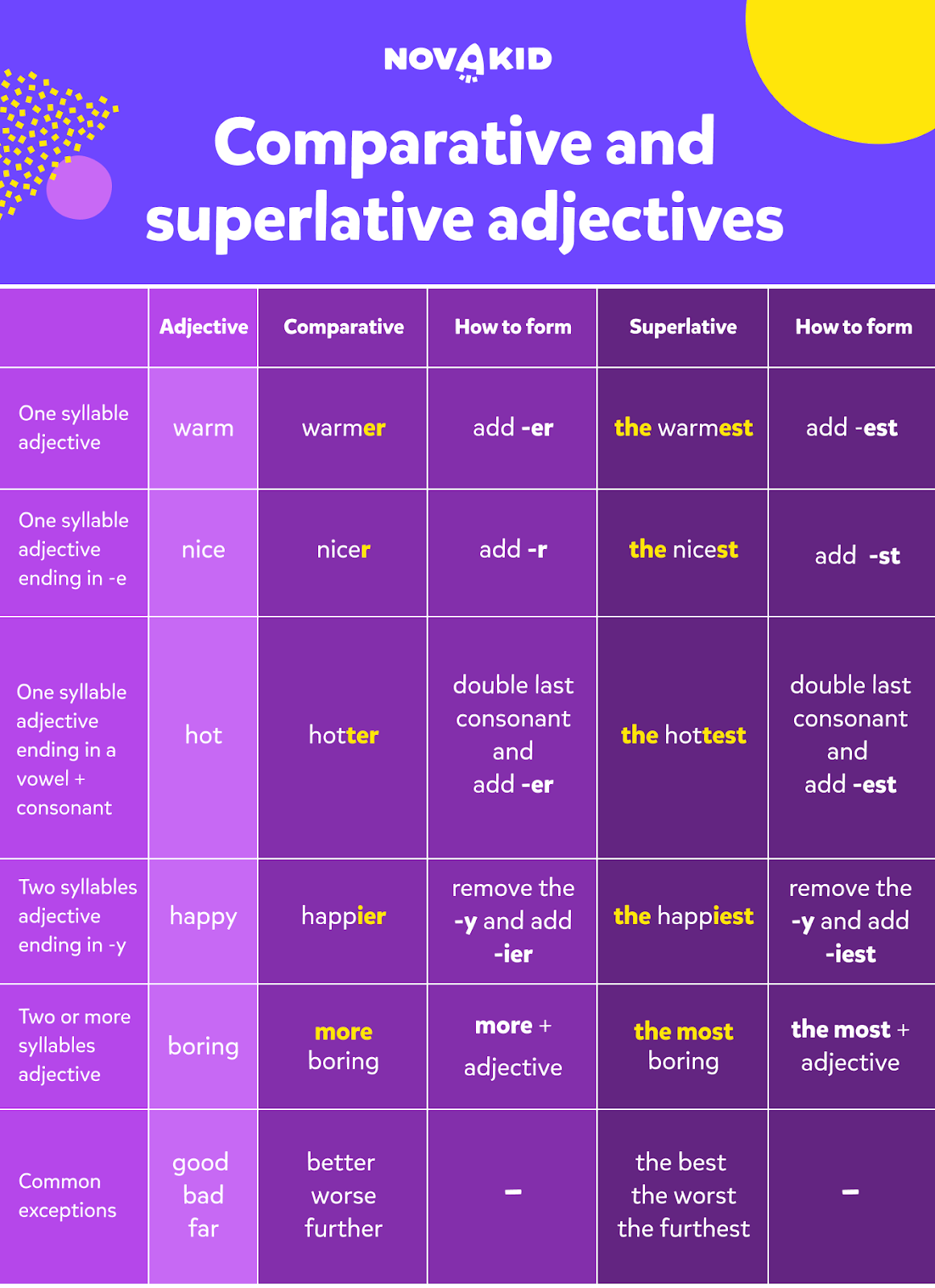 Comparative örneklerinde iki şeyi karşılaştırıyoruz, “-er” takısını veya “more” kelimesini kullanıyoruz. Superlative cümlelerinde ise birden fazla şeyi karşılaştırarak bir özelliğe en çok sahip olan şeyi belirtiyoruz, “-est” takısını veya “most” kelimesini kullanırken “the” artikelini unutmuyoruz – “my, your, our, their, her, his, its” gibi sahiplik zamirleri yoksa tabii.