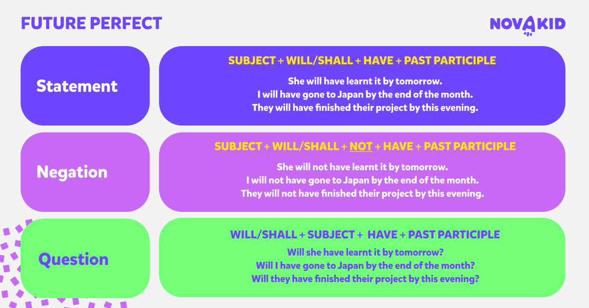 Future Perfect Tense ne olduğu gibi herhangi bir sorunuz varsa, blogumuza göz atın. ve diğer yararlı makaleler. Ayrıca, çocuklar için İngilizce dersleri arıyorsanız, nitelikli eğitmenlerimiz ile ilgi çekici, etkileşimli derslerimize göz atmayı unutmayın.