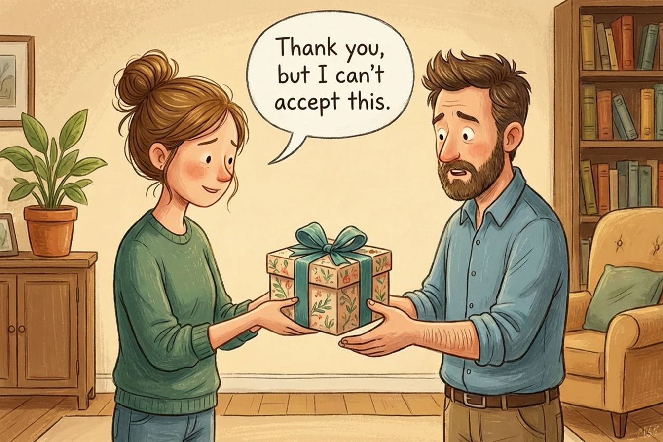 Bize verilen hediyeyi her zaman kabul etmek istemeyebiliriz. Bunun hediyeyi veren kişiye karşı yakın hissetmememiz, hediyenin kabul etmek içi fazla pahalı olması gibi çeşitli sebepleri olabilir. Ancak birçok insan için verilen hediyeyi reddetmek kabul etmekten çok daha zordur, doğru kelimeler üzerinde düşünmek gerekir. Böyle durumlarda kullanabilmeniz aşağıdaki ifadeleri sıraladık.