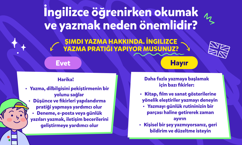 Gramer ve Kelime Bilgisi Tekrarı: İngilizce yazı yazarken dil maceranız boyunca öğrendiğiniz farklı dilbilgisi kurallarını ve kelimeleri aktif olarak kullanıyorsunuz. Yazma, tekrar yoluyla dilbilgisi kurallarını daha iyi anlamanızı sağlarken bir yandan da fikirlerinizi ifade etmek için size doğru sözcüğü aratarak kelime bilginizi de geliştirmenize yardım ediyor.