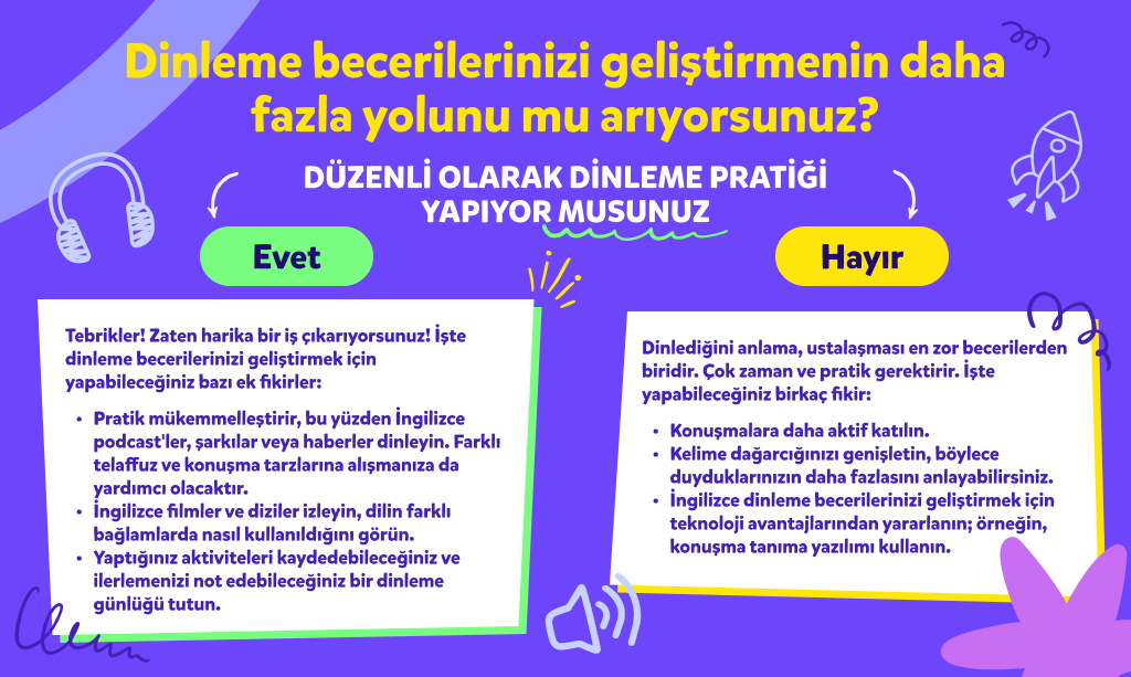 Diyaloglarda, filmlerde veya podcastlerde konuşulan İngilizceyi anlamakta zorluk mu yaşıyorsunuz? Herhangi bir dilde ustalığa ulaşmak dinleme yeteneklerinizi geliştirmekten geçiyor. İngilizce için de durum böyle. Dinleme yeteneklerinizi geliştirerek daha iyi iletişim kurabilir, farklı aksanları anlayabilir ve dili rahatça kullanabilirsiniz.