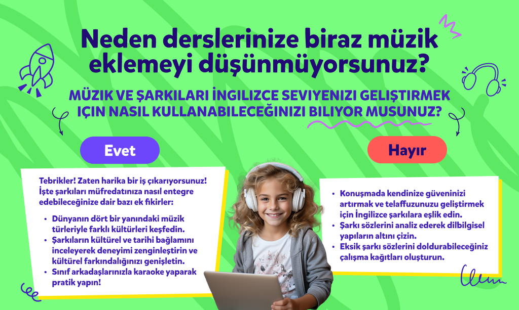 Bir şarkı söylerken hiç birden mutlu hissettiniz mi? Peki ya dil gelişimi için de şarkıları kullanabilseydiniz? İşte bu içeriğimizde bundan bahsedeceğiz. Müziğin ve şarkıların gücüyle İngilizce öğrenmeyi nasıl eğlenceli hâle getirebileceğinizi konuşacağız! Şarkıların kelime öğrenmeye olan faydasını, telaffuzunuzu ve kültürel farkındalığınızı nasıl geliştirebileceğini hep birlikte keşfedelim.